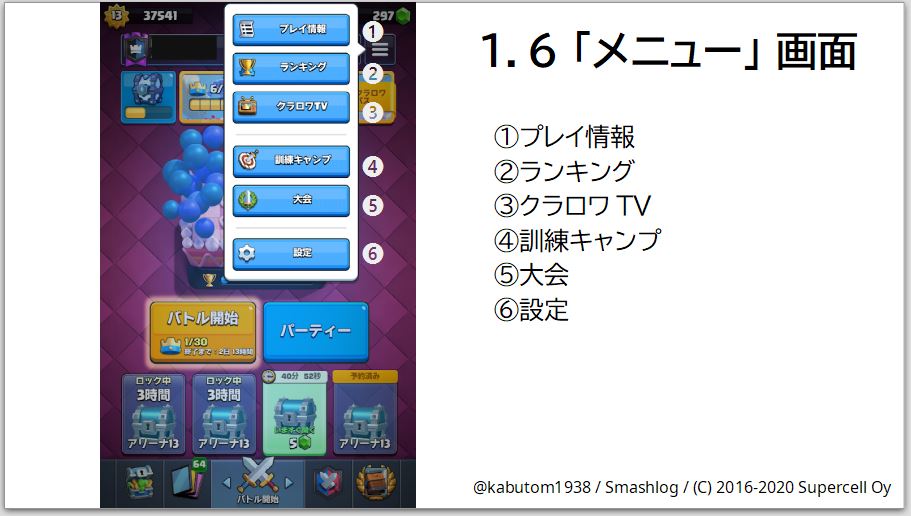 プレイ情報(1)では自分の対戦履歴やリプレイを、ランキング(2)では国内・世界の上位プレイヤーランキングを、クラロワTV(3)では世界中から選び抜かれたリプレイを見ることができます。