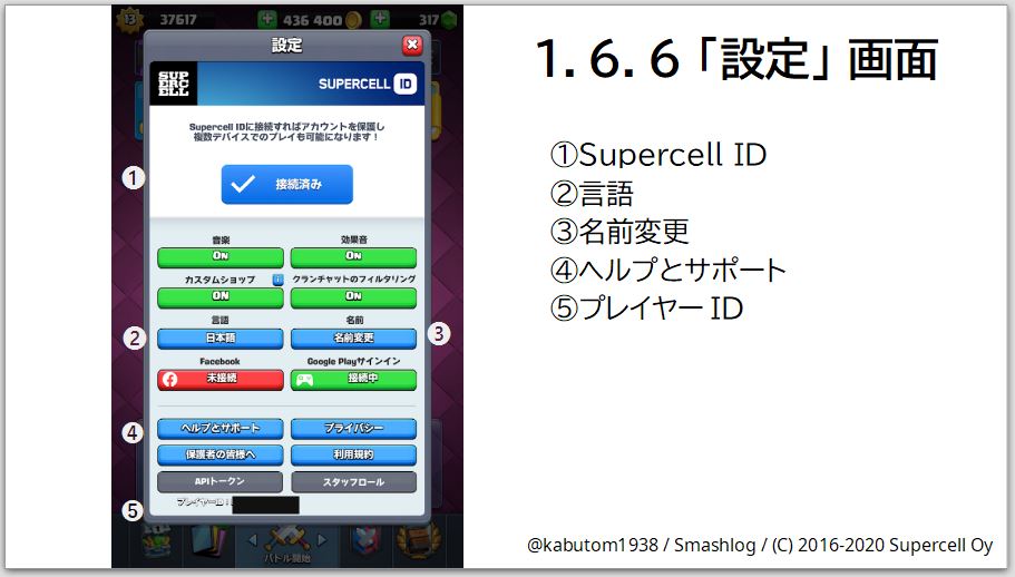 「プレイヤーID」は「設定」画面の最下部に書いてあります。紛らわしいので、混同しないようにしましょう。