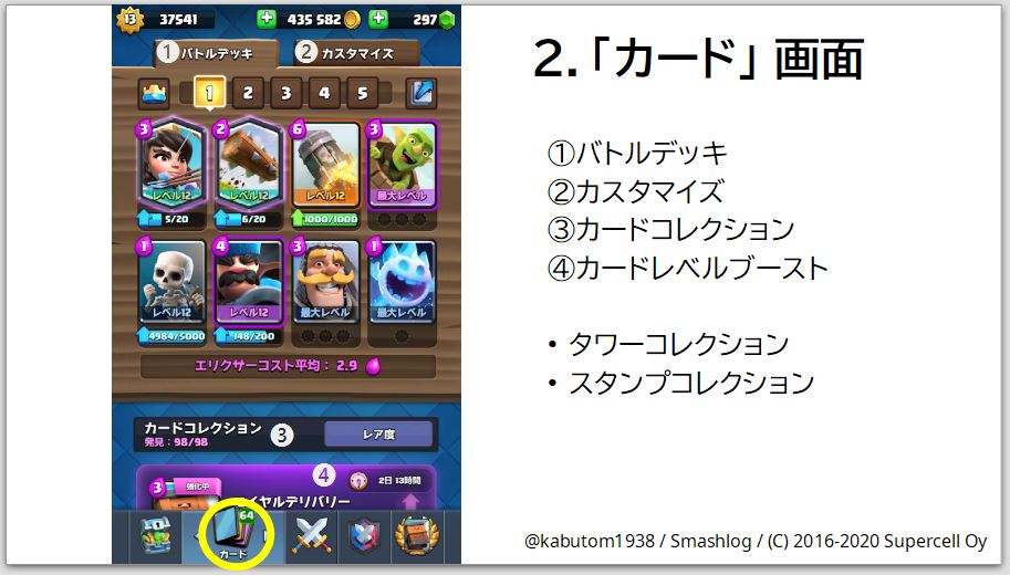 クラロワは8枚のカードでデッキを組んでバトルするゲームです。そのカードを管理したり、デッキを創ったりするのがこの「カード」画面です。