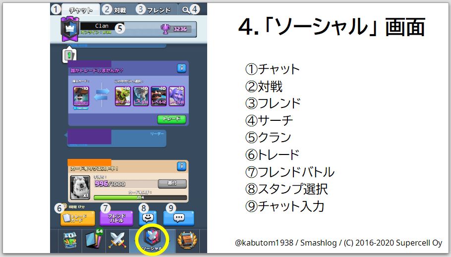 同じクランのメンバーとカードをトレード(6)したり、フレンドバトル(7)で練習したりして、強くなっていきましょう。