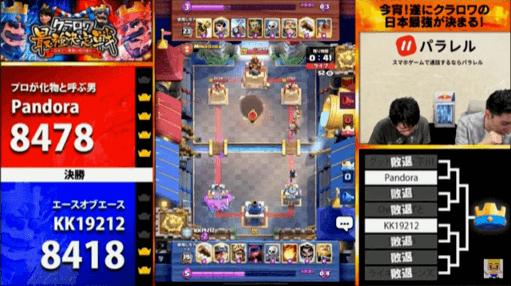 さらにプリンス、ディガーを追加し、キングタワーも大きく削ることに成功。その後も攻めの姿勢を緩めず、2本目のタワーも折り切りPandora選手が勝利。