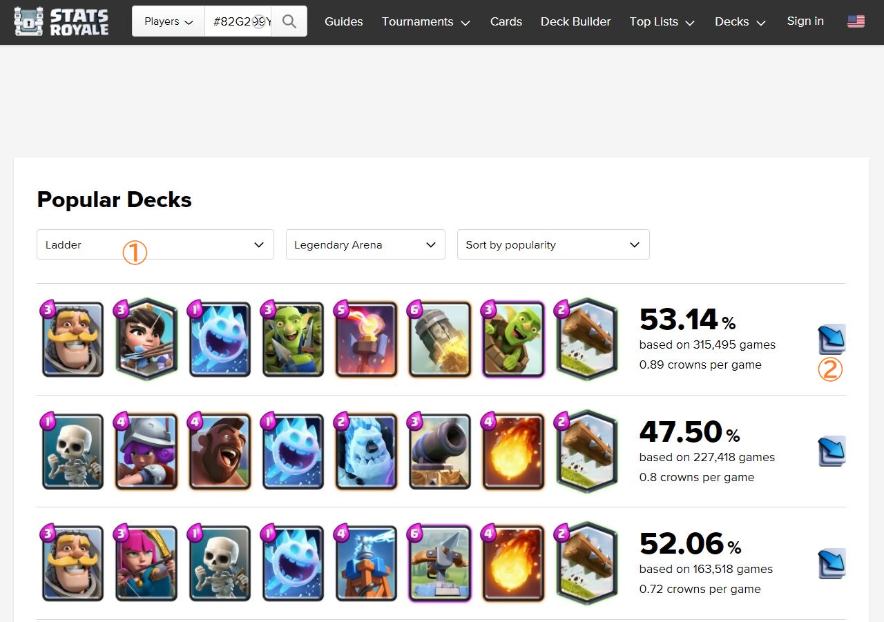 使用率か勝率で並べ替えできます。試してみたいデッキを見つけたら、②(Copy deck)からデッキをコピーし、ゲーム内で試してみましょう。