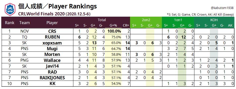 1v1セット無敗(6W0L)のRuben選手に、Ruben選手以外にはほぼ負けなかったMugi選手、2v2セット無敗(3W0L)のSKペアに、paiN快進撃の立役者Wallace選手。