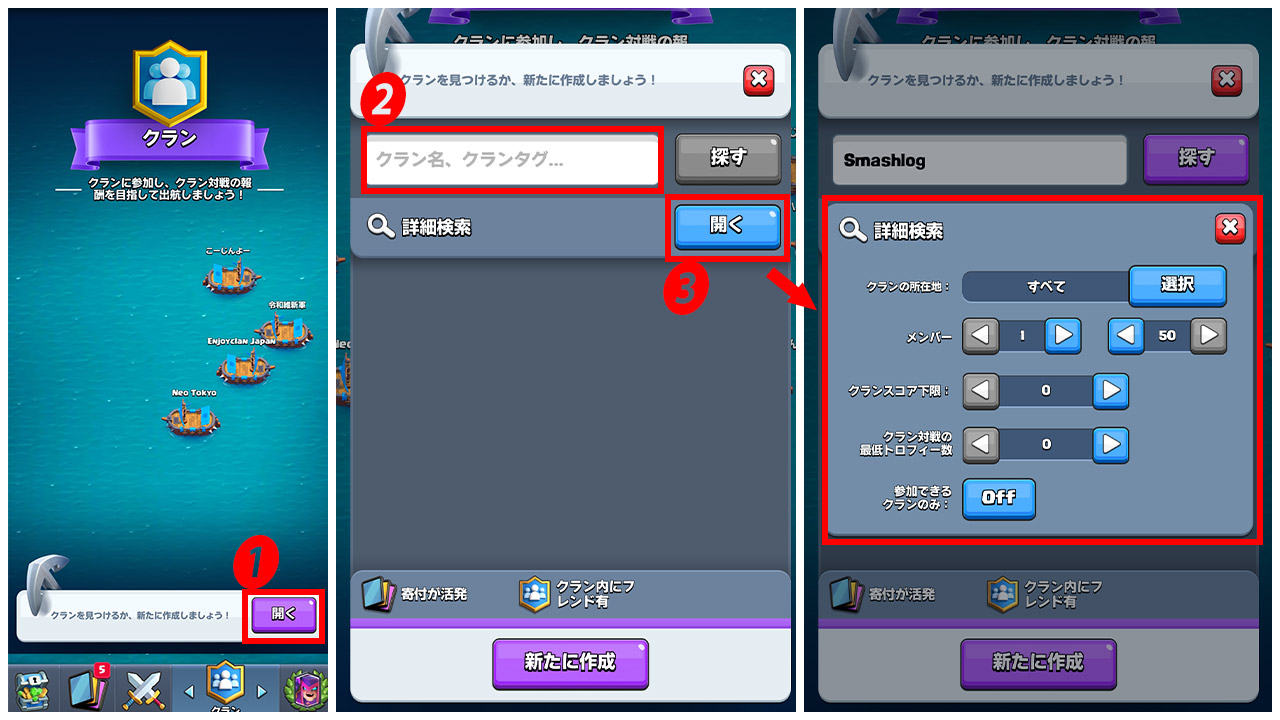 詳細検索では、クランの所在地や参加するための最低トロフィーを絞り込んで検索することができます。
