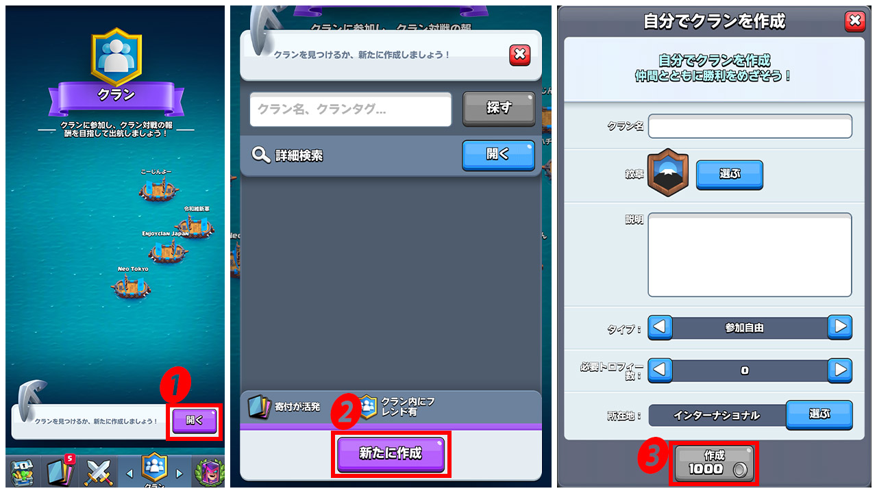自分でクランを作ってメンバーを集めたい!という方は、新しくクランを作ってみましょう。
