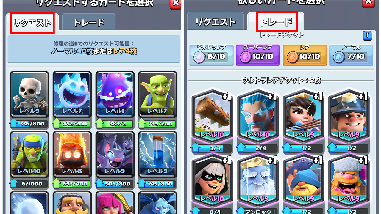 トレードチケットを使えば、クランメンバーとレアリティに応じたカードを交換することができます。