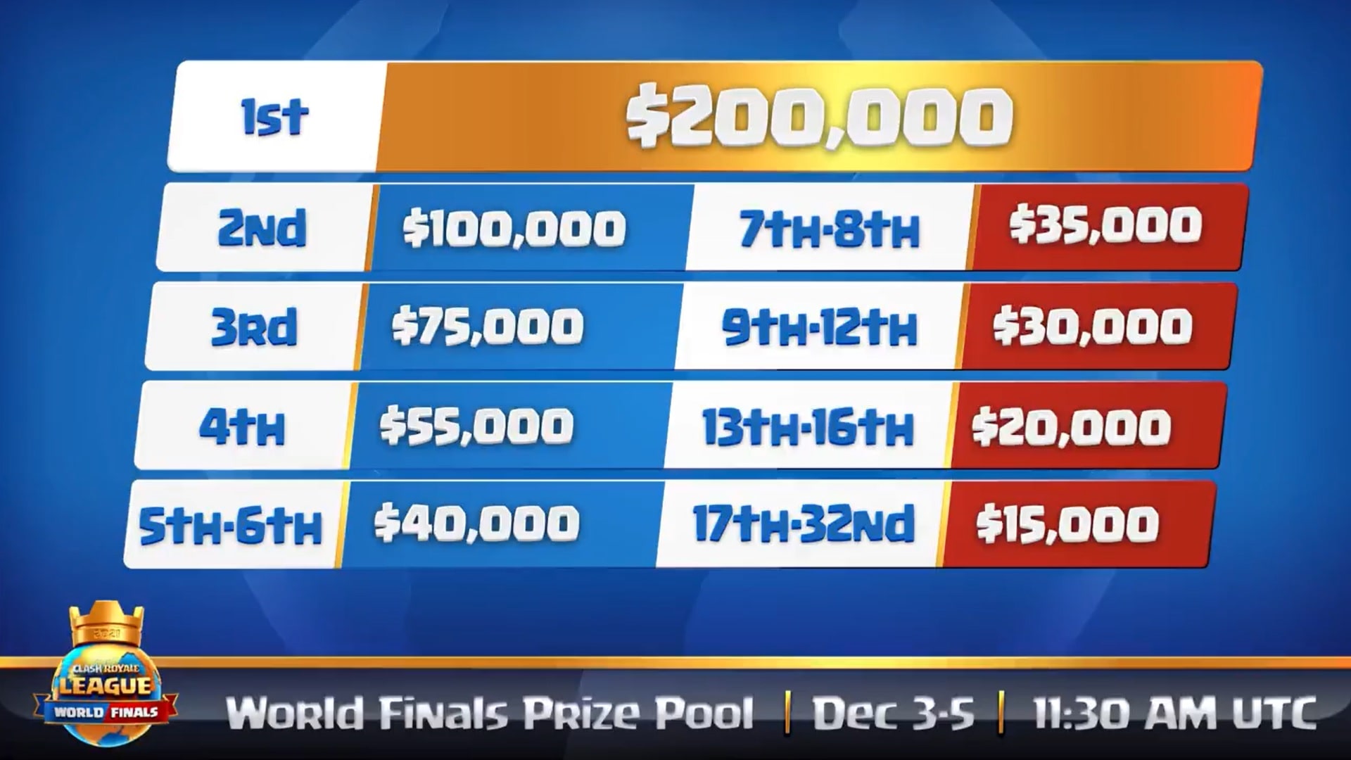 年間の賞金総額は1,600,000ドル(約1.8億円)以上、世界一決定戦の優勝賞金は200,000ドル(約2,200万円)というクラロワeスポーツ史上最高額が設定されました。